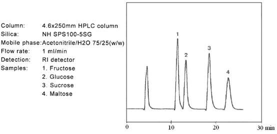 糖類物質的分析和制備,在液相色譜領域占有重要的地位。迄今為止,大多數的分離介質僅僅局限在分析級別。但是富士硅膠研發出用于制備色譜的新的氨基硅膠。當使用高水相為流動相時,一般的氨基填料會暴露出很多問題。氨基硅膠的pH值很高,一般pH為9.0,在這樣高的pH條件下,目標化合物一般都會變性,并且會毀壞硅膠基質的表面??紤]到這些問題,富士公司研發出新的氨基硅膠填料,稱之為NH SG硅膠。NH SG硅膠可以最小化甚至是避免上述問題,并且對糖類化合物進行更好的分離。