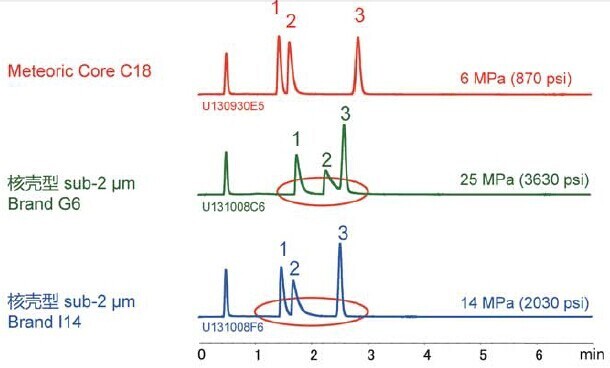 Meteoric Core C18與常規使用的全多孔型C18相比,在相同條件下可使分析時間縮短至2/3。因其具有卓越的分離能力,即使將流速提高1倍,仍可維持高效的理論塔板數狀態并使分析時間縮短至1/3,而此時色譜柱背壓不足5000psi,與普通Sub-2um色譜柱相比,色譜柱背壓更低的Meteoric Core C18HPLCUHPLC的使用分析中提供了高性能高生產性的新選擇。