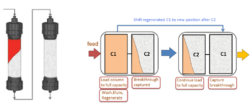 ??? ?? 傳統(tǒng)層析工藝,由于流穿效應(yīng),有30-50%的填料是無法被完全利用的,從而使得載量和處理量大為受限。Capture SMB用于優(yōu)化捕獲環(huán)節(jié),作為最簡單和最優(yōu)化的2柱位設(shè)計,可使純化效率顯著提高,并且使填料用量大為縮減。
