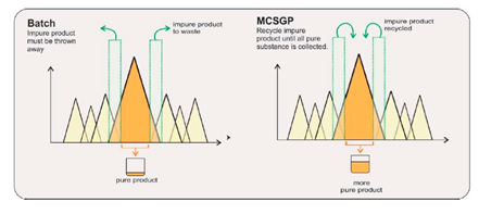 ????? MCSGP(Multicolumn Countercurrent Solvent Gradient Purification)用于精純環(huán)節(jié),無需通過耗時的實驗設(shè)計(DoE)確定工藝條件,可有效克服典型SMB(模擬移動床)僅適用于二元分離、無法實現(xiàn)線性梯度的缺點。