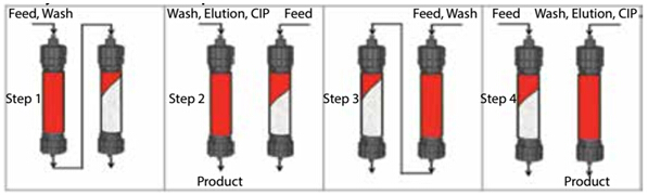 ? ? ?Capture SMB是將第一根層析柱的抗體/蛋白流穿繼續(xù)上樣至第二根層析柱,待第一根層析柱完全滿載后,方結束其上樣進行淋洗,并繼續(xù)進行洗脫、再生、再平衡操作,而此時第二根層析柱會獨立進行上樣操作。通過切換柱位操作,保證2根層析柱的洗脫、再生、上樣等操作交替銜接進行,從而實現(xiàn)工藝與系統(tǒng)硬件設計的完美結合,使填料利用率最大化,累積用量大為縮減。
