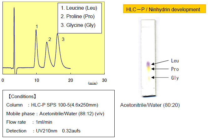 ????因此,對于極性化合物的洗脫,HILIC模式和反相模式是互補的。富士硅化學有限公司開發了兩款HILIC模式的填料,命名為“HLC”硅膠。兩種HLC硅膠都含有兩性的官能團,共價鍵合在硅膠表面。“HLC-A”用于分離純化有機酸、核酸和糖類;“HLC-P”用于分離氨基酸、多肽。