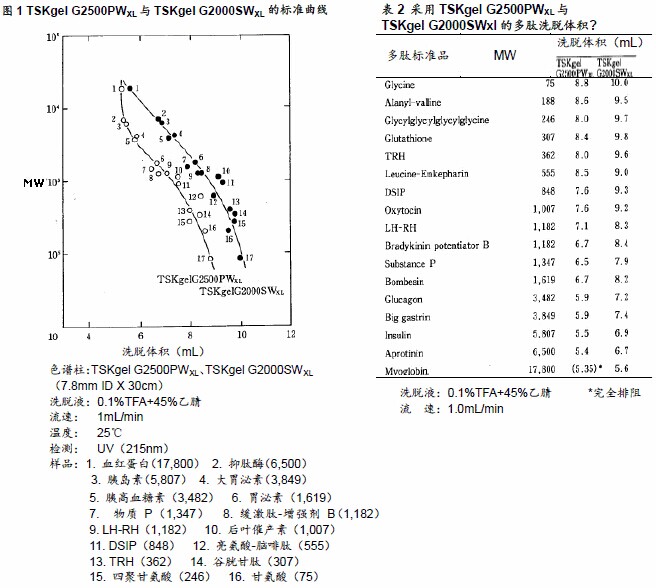 ??? 本報(bào)告中,將針對(duì)這些填充劑(TSKgel G2000SWXL以及TSKgel G2500PWXL)在多肽分離的應(yīng)用上進(jìn)行探討。