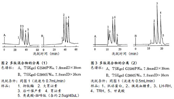 ??? 圖2、3所示為TSKgel G2500PWXL與TSKgel G2000SWXL在分離多肽標(biāo)準(zhǔn)品時(shí)的對(duì)比圖。通過(guò)色譜圖可以明確的看出,TSKgel G2000SWXL吸收峰形與分離帶的寬度均更佳,因此其分離性能更為優(yōu)異。另一方面,如果多肽的分子量小于1000,由于樣品與填充劑之間的某些相互作用,使用TSKgel G2500PWXL時(shí)的分離效果要高于TSKgel G2000SWXL。例如圖2中所示的后葉催產(chǎn)素(MW1007)與亮氨酸-腦啡肽(MW555)、以及圖3所示的TRH(MW362)與甘氨酸(MW75)均顯示了其分離效果高于TSKgel G2000SWXL。