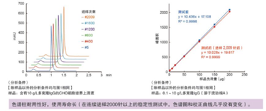 4. 連續進樣測試中的色譜圖以及進樣測試前后的IgG校正曲線