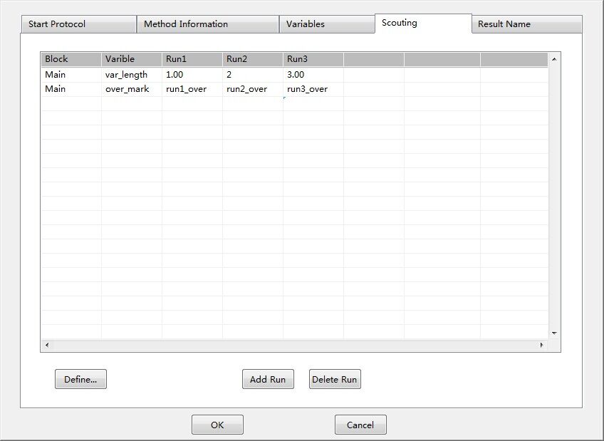 Scouting,即探索功能,通過將方法中的某些參數編輯成變量,然后通過Scouting設置,將同樣的方法運行多次,每次僅僅是自動修改方法中的某個或某些參數,從而實現參數的自動尋優(yōu),譬如尋找最適合的流速、尋找最適合的裝柱高度等。