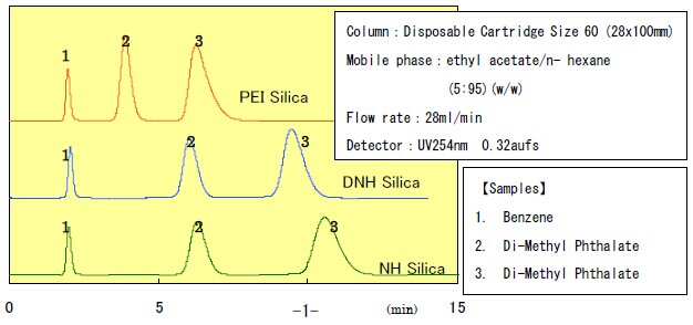 PEI硅膠鍵合的二元胺和三元胺是NH硅膠的3倍。基于這個原因,PEI硅膠的堿度要比NH硅膠強,并且由于碳鏈較長,PEI硅膠的氫鍵作用要比NH硅膠弱一些。