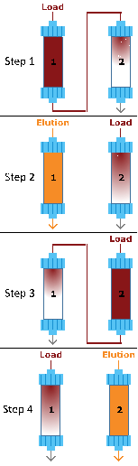 步驟?1:在連續上樣階段,柱1和柱2保持串聯。柱1滿載樣品(紅色),其流穿被柱2捕獲。