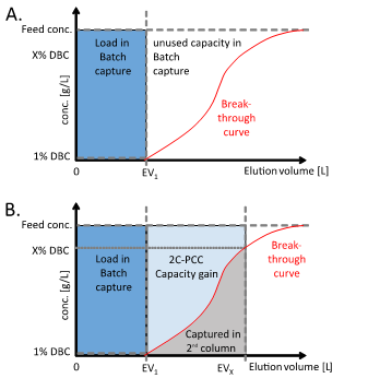 2.普通層析和PCC載量利用率對比圖。圖A為批處理上樣。在批處理的捕獲過程中,當樣品出現流穿時,上樣必須結束,從而避免樣品損失。圖B:在2C-PCC連續上樣階段,第1根層析柱進行上樣,直至出現流穿(例如70%流穿),流穿樣品被第2根層析柱捕獲。因此,第1根層析柱的載量利用率得到顯著提高。