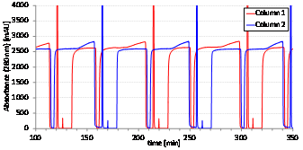 AutomAb?動態控制功能可保證2C-PCC實現最優操作。在各種情況下,例如樣品濃度或層析填料載量的變化,都是可以得到補償的。AutomAb? 確保連續流層析可用于處理存在上樣成分變化的 灌流細胞培養。